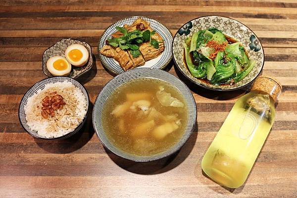 鮮魚片湯 130元+C套餐(159元) 雞油飯、溏心蛋、燙青菜、滷腐竹、冷泡茶