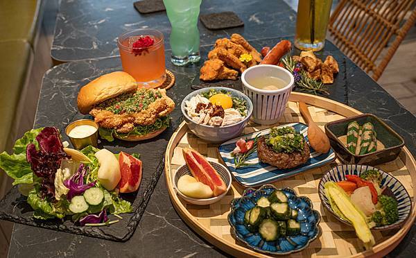 「手工純牛肉堡佐蔥鹽醬定食」、「分享小拼盤」,還有兩杯調酒。
