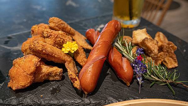 這是很經典的下酒菜四件套,有小雞腿、雞翅、小香腸、炸杏鮑菇。